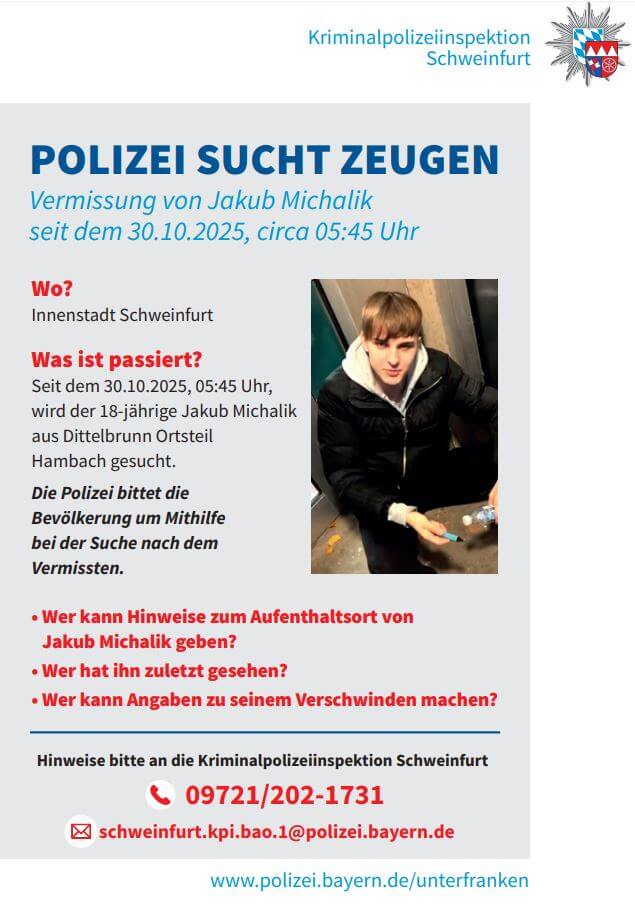 Der 18-jährige Jakub Michalik aus dem Dittelbrunner Ortsteil Hambach wird immer noch vermisst. Seit dem 30. Oktober fehlt jede Spur. Gegen 3 Uhr nachts war er da zuletzt Bekannten in der Sonnen- und der Damaschkestraße in der Schweinfurter Innenstadt begegnet. Die Polizei hat ein Sonderkommission gegründet, das bei der Suche in jede Richtung ermittelt.